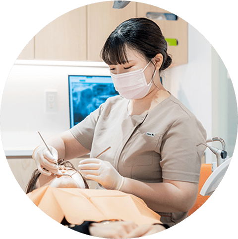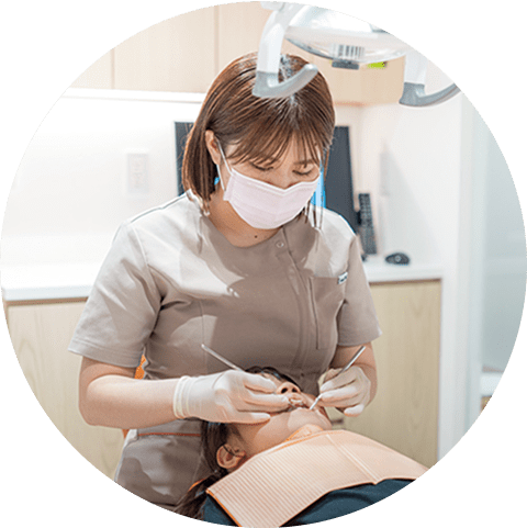 担当歯科衛生士による定期的なメンテナンスです。健康な口腔内を維持するためには、セルフケアだけでなく歯科衛生士によるメンテナンスが欠かせません。メンテナンスでは、クリーニングの他、むし歯や歯周病のチェック、歯磨き方法や生活習慣の見直しを行います。治療後の再発を防ぎ、一生涯にわたって健康なお口を守り続けるサポートをします。