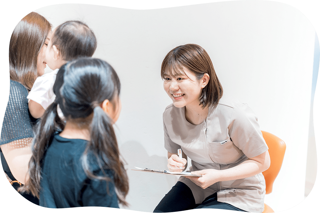 歯科衛生士が子どもや保護者と歯の状態や口腔習癖について話し、診察を行って口腔内の健康状態を確認します。